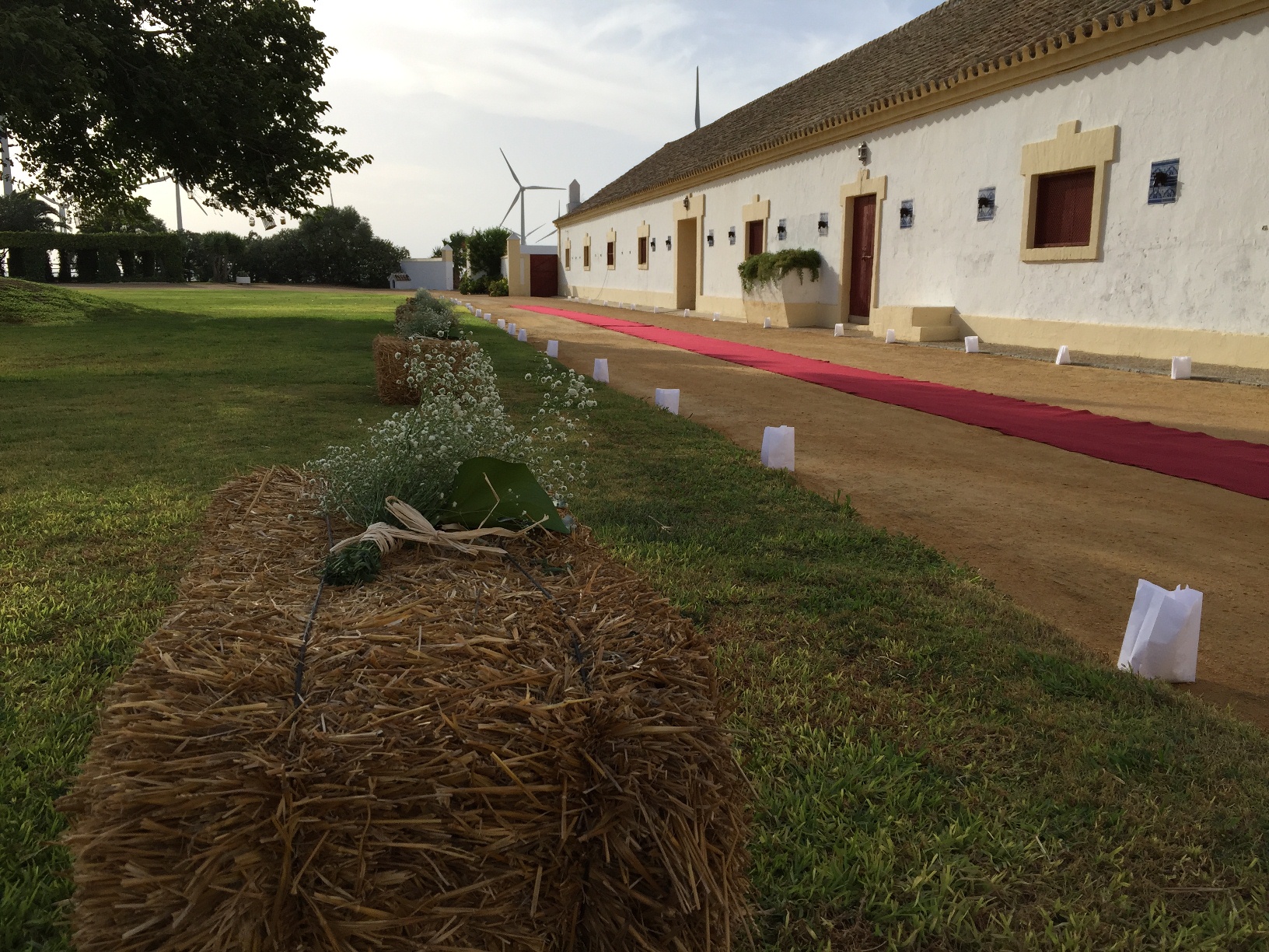 Jardín con alpacas, alfombra y velas para boda en Dehesa Bolaños